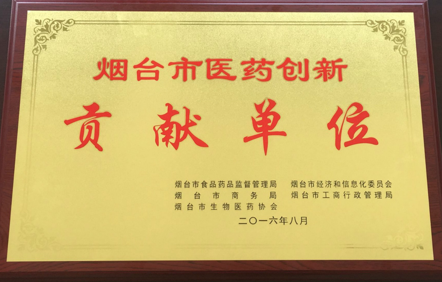 2016年上半年,由煙臺(tái)市食品藥品監(jiān)督管理局、經(jīng)濟(jì)和信息化委員會(huì)、商務(wù)局、工商行政管理局、生物醫(yī)藥協(xié)會(huì)等五部門共同開展了《關(guān)于開展煙臺(tái)市醫(yī)藥創(chuàng)新發(fā)展杰出貢獻(xiàn)單位評(píng)選》活動(dòng),經(jīng)過半年的申報(bào)評(píng)選,煙臺(tái)巨先藥業(yè)有限公司最終被評(píng)選為“煙臺(tái)市醫(yī)藥創(chuàng)新貢獻(xiàn)單位”。